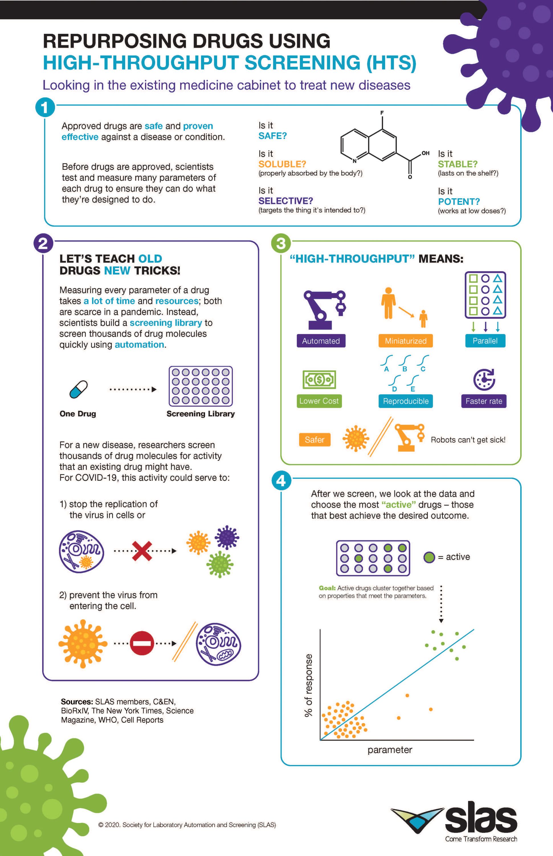 Learn how researchers use high-throughput screening (HTS) to determine whether existing drugs can be repurposed as possible treatments for COVID-19.
