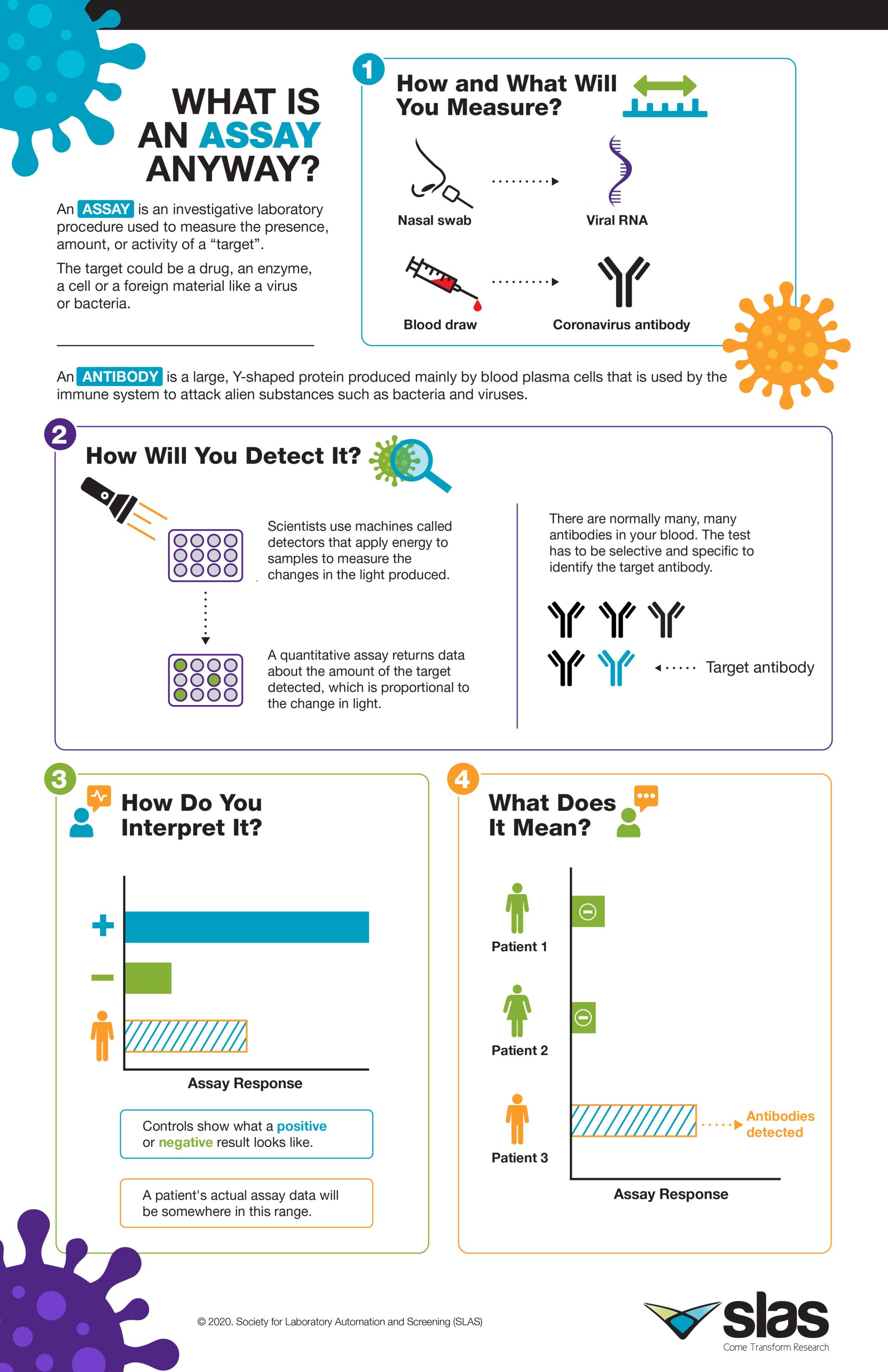 SLAS has created a series of infographics to help explain the technical and often complex terms discussed during the COVID-19 pandemic. These infographics will help illustrate, in very basic terms, the scientific research behind the ongoing work that is being done in labs worldwide to better understand the nature of the virus, diagnose and manage patients, develop vaccines, and discover more effective ways to stop the pandemic and save lives.